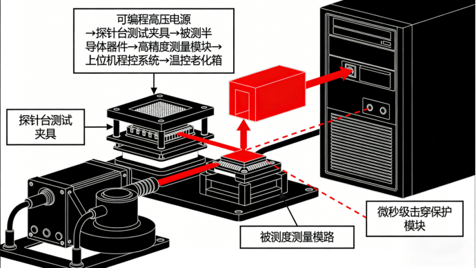 【应用介绍】是半导体分立器件、集成电路出厂前的核心可靠性测试环节,包括器件绝缘耐压测试、介电击穿测试、高温反偏老化测试(HTRB)、雪崩耐量测试、漏电流测试,筛选出存在缺陷的不合格器件,保障产品出厂可靠性,适配 IGBT、MOSFET、二极管、光耦、集成电路等全品类…