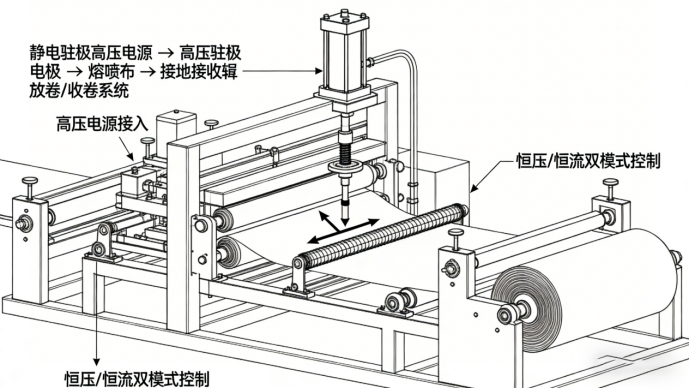 【应用介绍】静电驻极是医用口罩、空气净化器滤材生产的核心工艺,通过高压静电场对熔喷布进行电荷注入,使聚丙烯熔喷布带上持久的静电电荷,通过静电吸附效应捕捉气溶胶、病毒、颗粒物,使滤材在低呼吸阻力的同时,过滤效率提升至 95% 以上,满足医用外科口罩、N95 口罩…