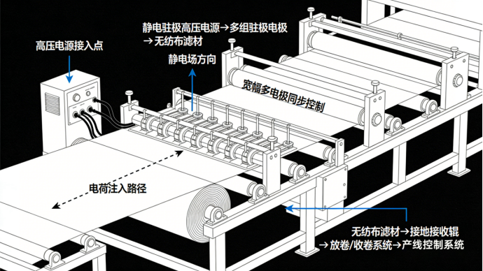 【应用介绍】静电驻极是高效空气滤材生产的核心工艺,通过高压静电场向聚丙烯、聚酯等非织造滤材注入持久静电电荷,利用静电吸附效应捕捉气溶胶、颗粒物、病毒、细菌,使滤材在低呼吸阻力的同时,过滤效率大幅提升,广泛应用于医用口罩、空气净化器、洁净室高效过滤器、汽…